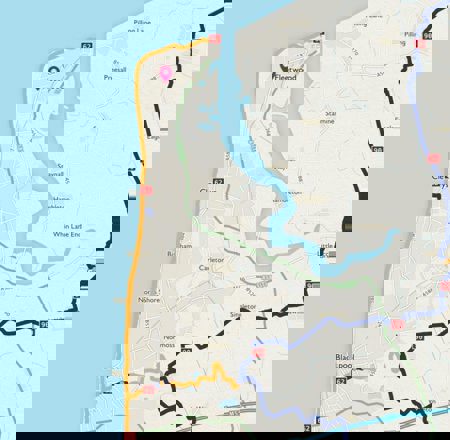 Ar hyd y ffordd byddwch chi'n pasio Cleveleys sy'n lle da i stopio am damaid i'w fwyta neu luniaeth - fe welwch siopau sglodion glan môr, caffis a bariau.