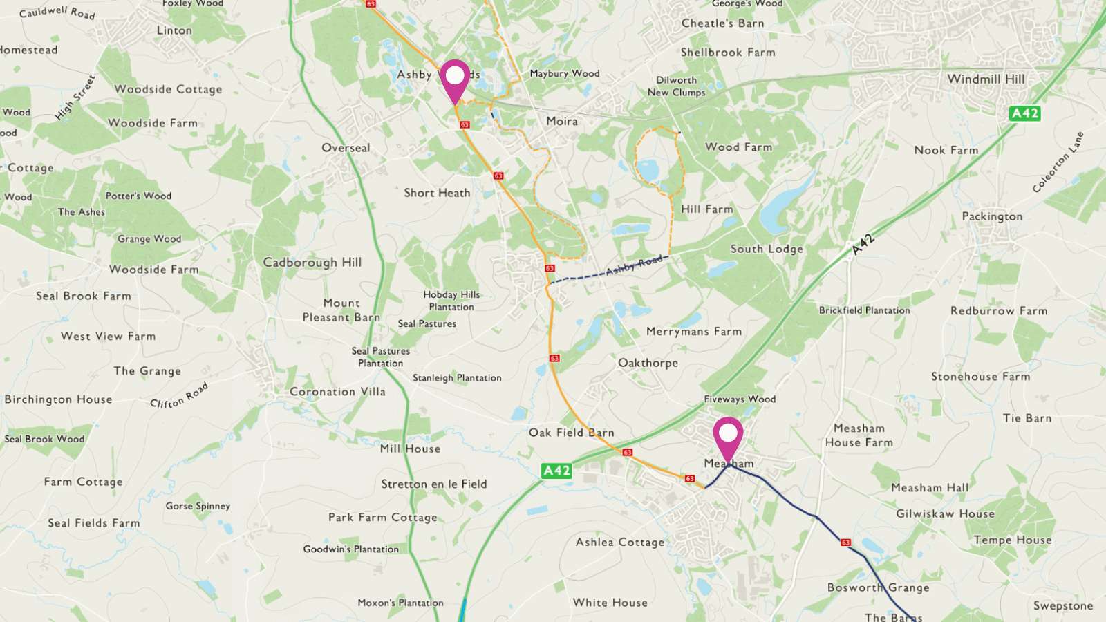 The route runs from Measham to Moira passing through countryside which is rich in social and industrial history. You will pass through old Donisthorpe Colliery site, now a Woodland Park, and there are links to the old mining village of Oakthorpe and Moira Furnace, thought to be the best-preserved 19th-century blast furnace in Europe. At Moira, you can visit Conkers, a forest-themed attraction with a wide variety of indoor and outdoor activities.