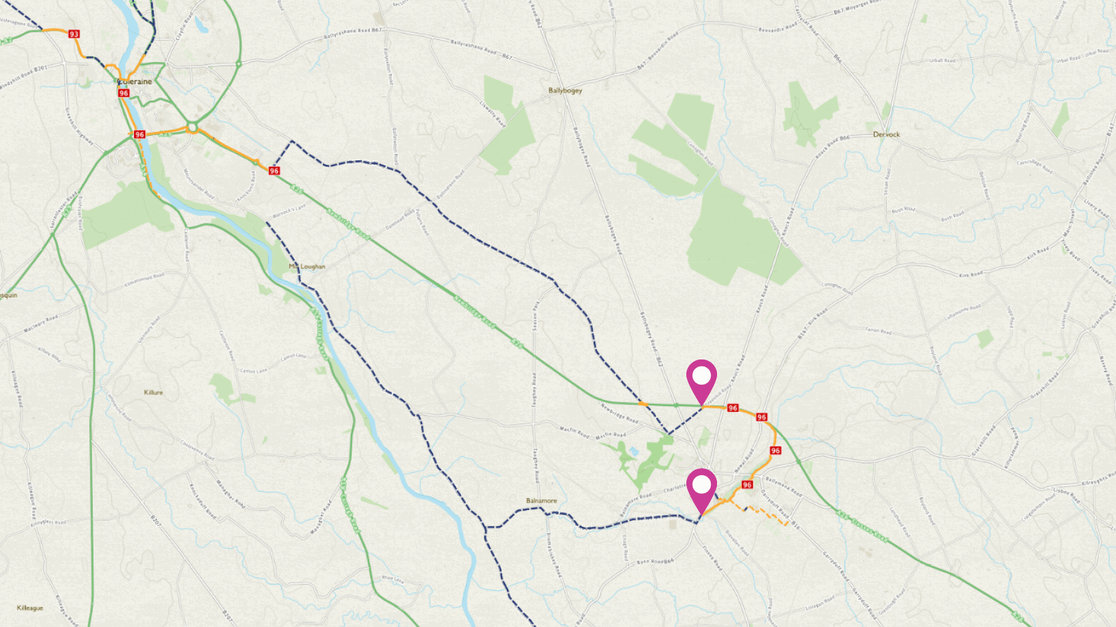This route formerly ran from the top of Lough Neagh to Coleraine on the North Antrim coast.