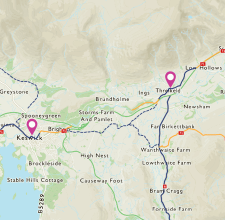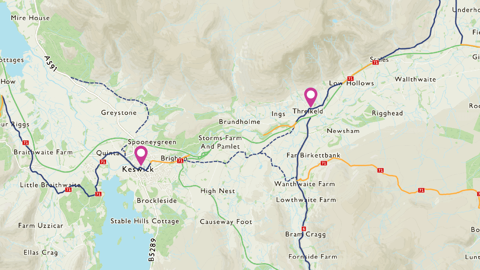 The Keswick to Threlkeld Railway Trail begins in the car park of the swimming pool at Keswick and continues along the trackbed of the old Cockermouth, Keswick and Penrith railway - an easy ride through the beautiful tree-clad Greta Gorge which is ideal for traffic-free family rides and walks.