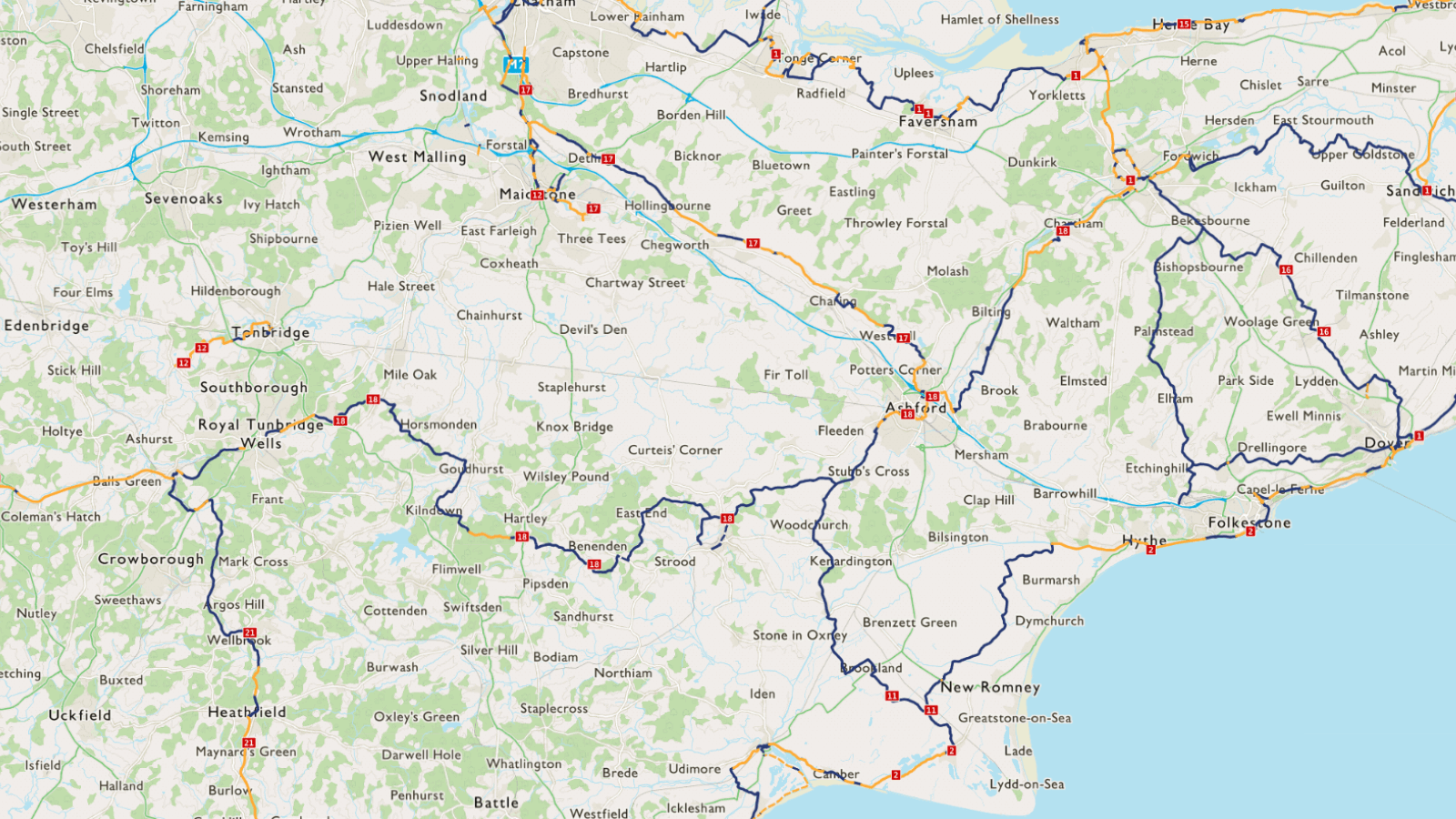 The route is open and signed from Canterbury to Royal Tunbridge Wells. There is a gap between Mystole and the A28 near Godmersham, and near Dingleden.