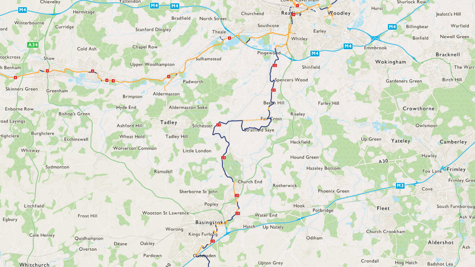 Locally known as the Calleva Trail and forming a key section of the National Cycle Network in Hampshire, the route follows traffic-free and on-road sections between Basingstoke Town Centre and Chineham, and then follows quiet lanes passing Silchester and then through West Berkshire and on to Reading. Due to development in the area, these roads are busier than they used to be.