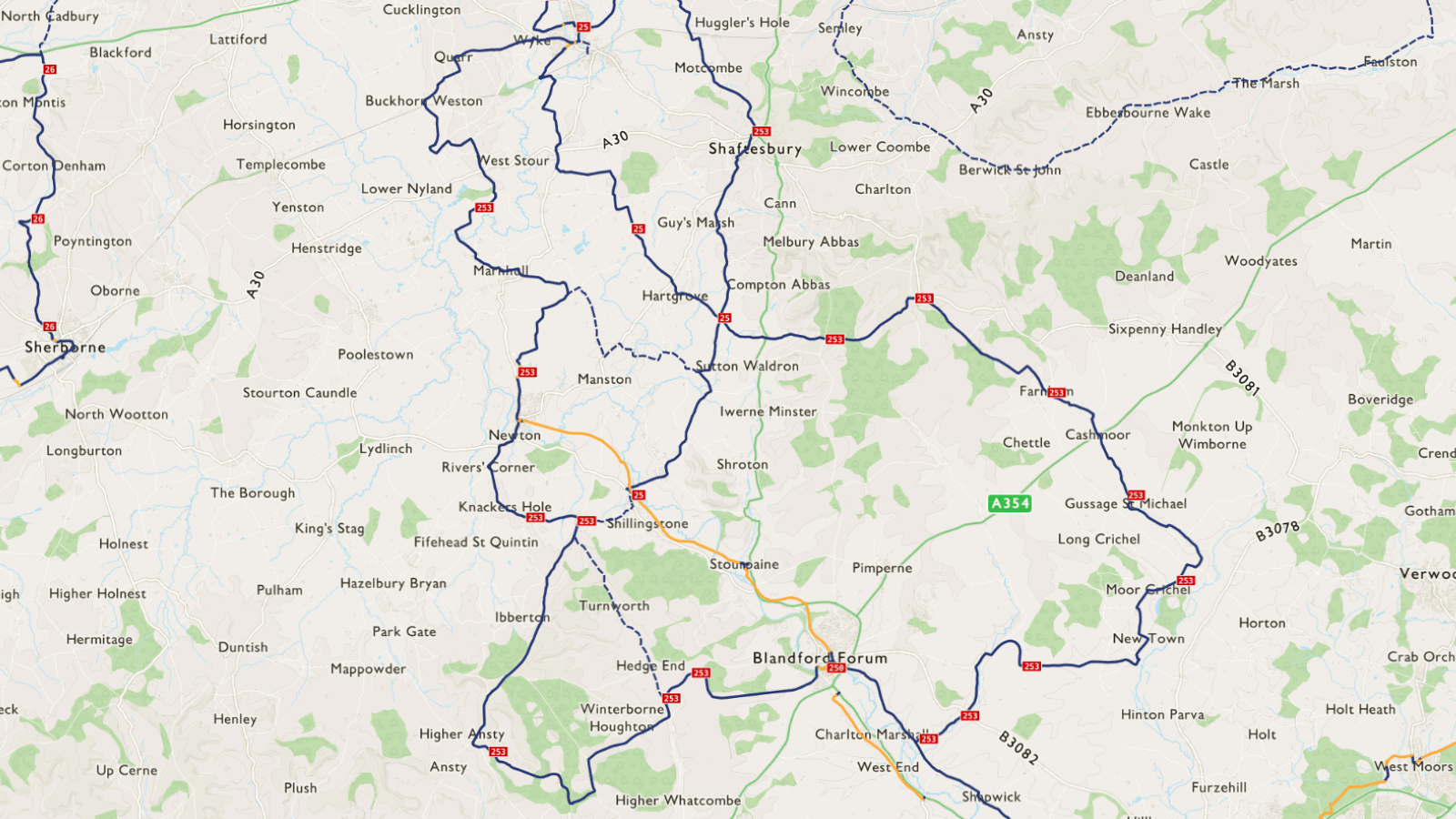 This route surrounds Route 25 much like a figure of 8, meeting at Gillingham, near Iwerne Minster, and Blandford Forum. The route is a continuous loop except for at Blandford Forum where it breaks at Blandford Bridge to the south-west of the town.
