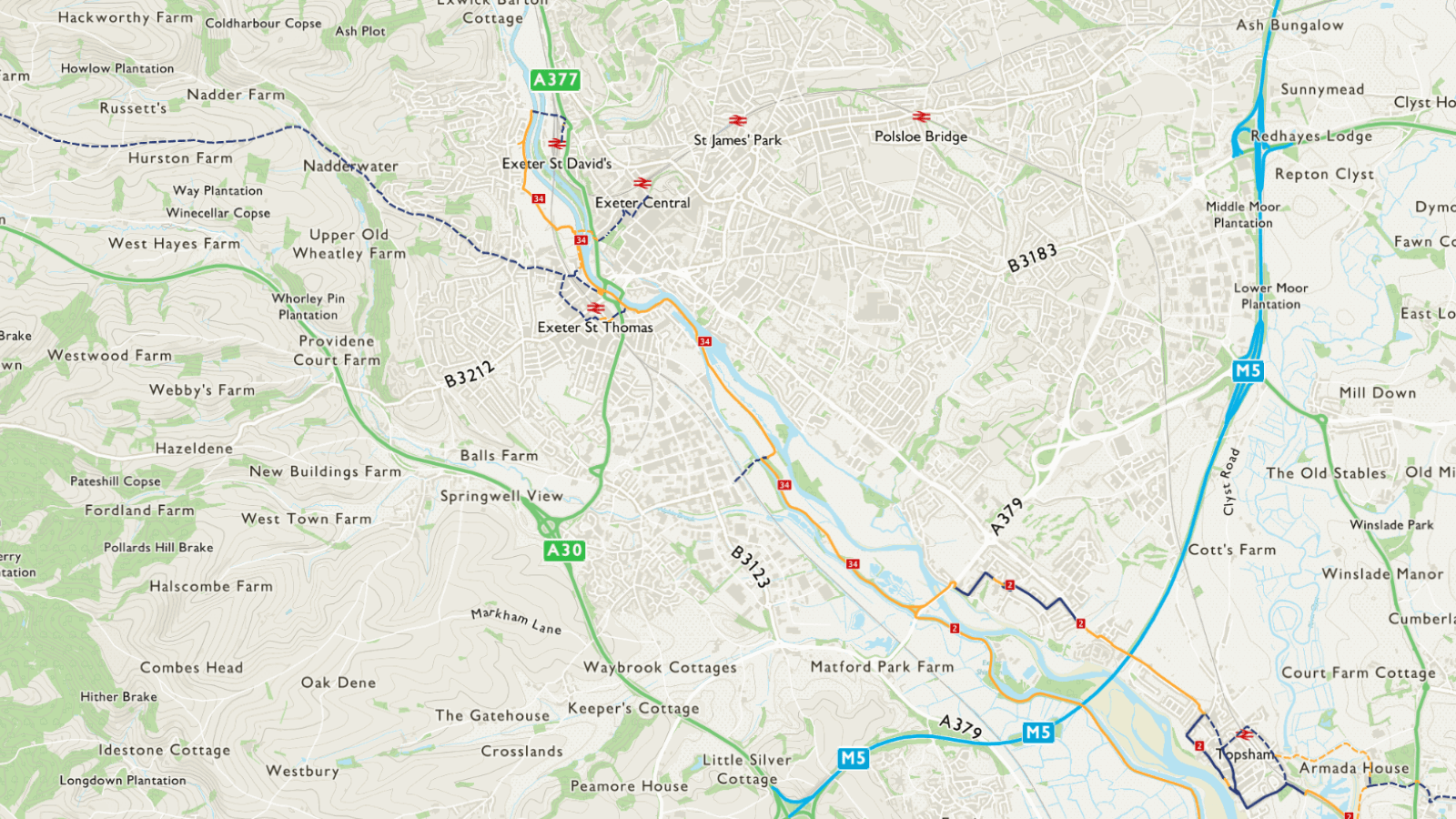 Starting from Exeter St David’s station the route crosses the River Exe via a bridge on Station Road and then turns south to follow paths alongside the River Exe and then Exeter Canal. The route travels through the Riverside Valley Park and links with National Route 2 at Bridge Road. National Route 2 continues on the Exeter Canal all the way to Exminster.