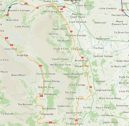The route then continues northwards from Pontymoile along the canal towpath to the boundary with the County Borough of Monmouthshire at Mamhilad. Route 492 branches from Route 49 at Forge Hammer, Cwmbran and runs northwards to Pontypool.