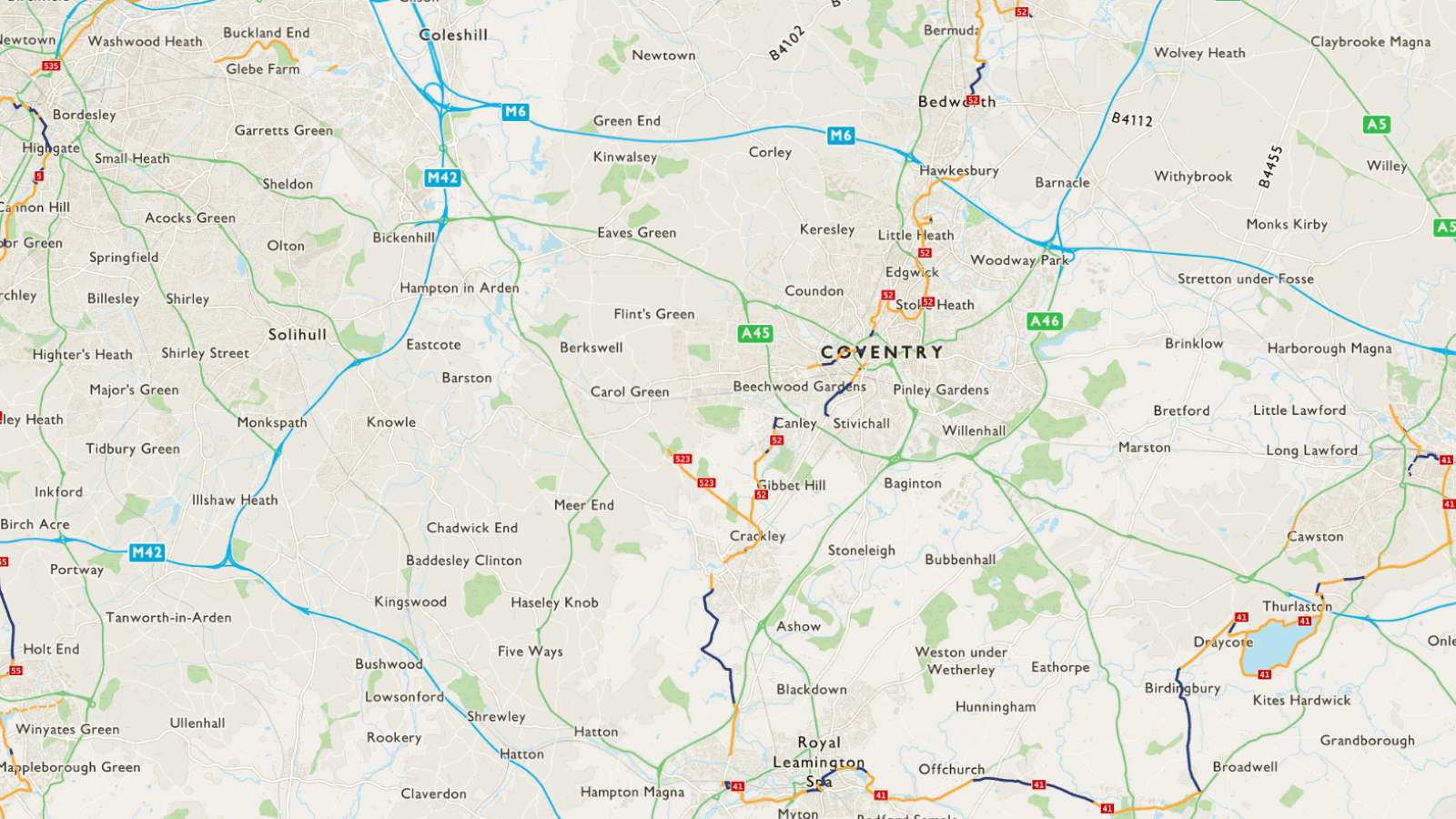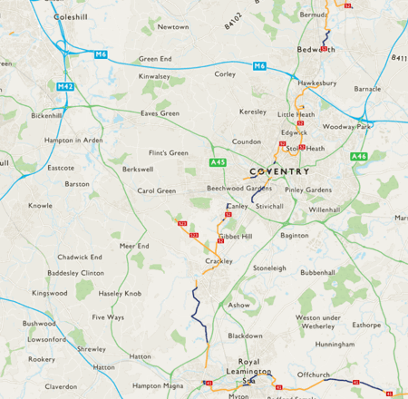Route 52 starts at Warwick and finishes just west of Loughborough, where it joins National Route 6, via Kenilworth, Coventry, Nuneaton and Coalville. There are some short gaps through Coventry and Kenilworth city centres and in the suburbs of Coventry.