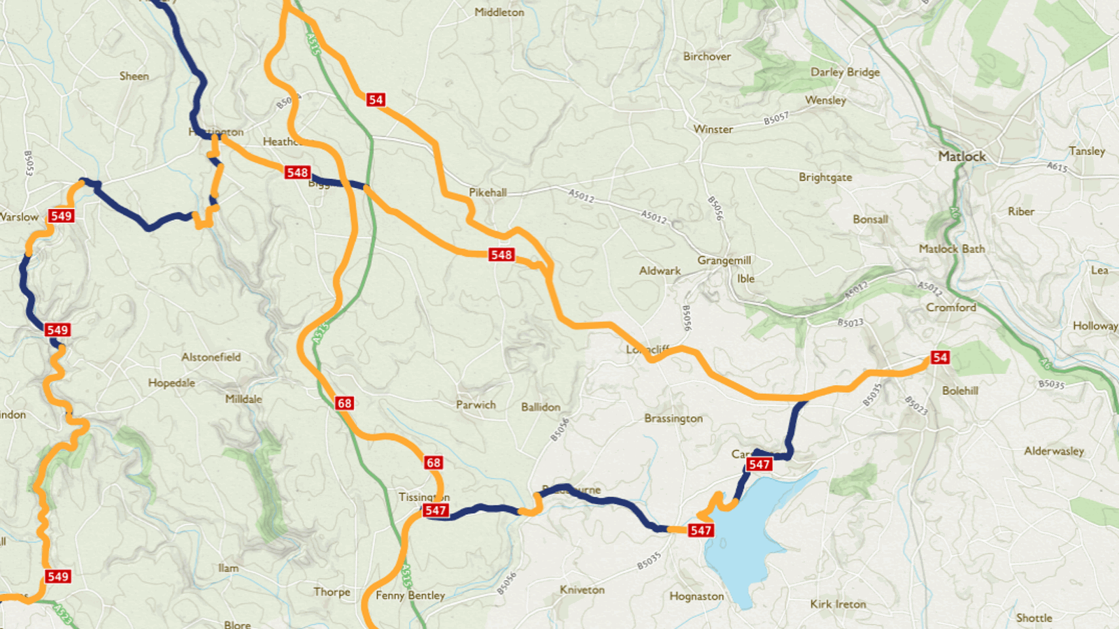 This route links west to east across all three major National Routes in the area from the High Peak Trail, crossing the Tissington Trail and meeting National Route 549 at Hartington in the Peak District National Park.