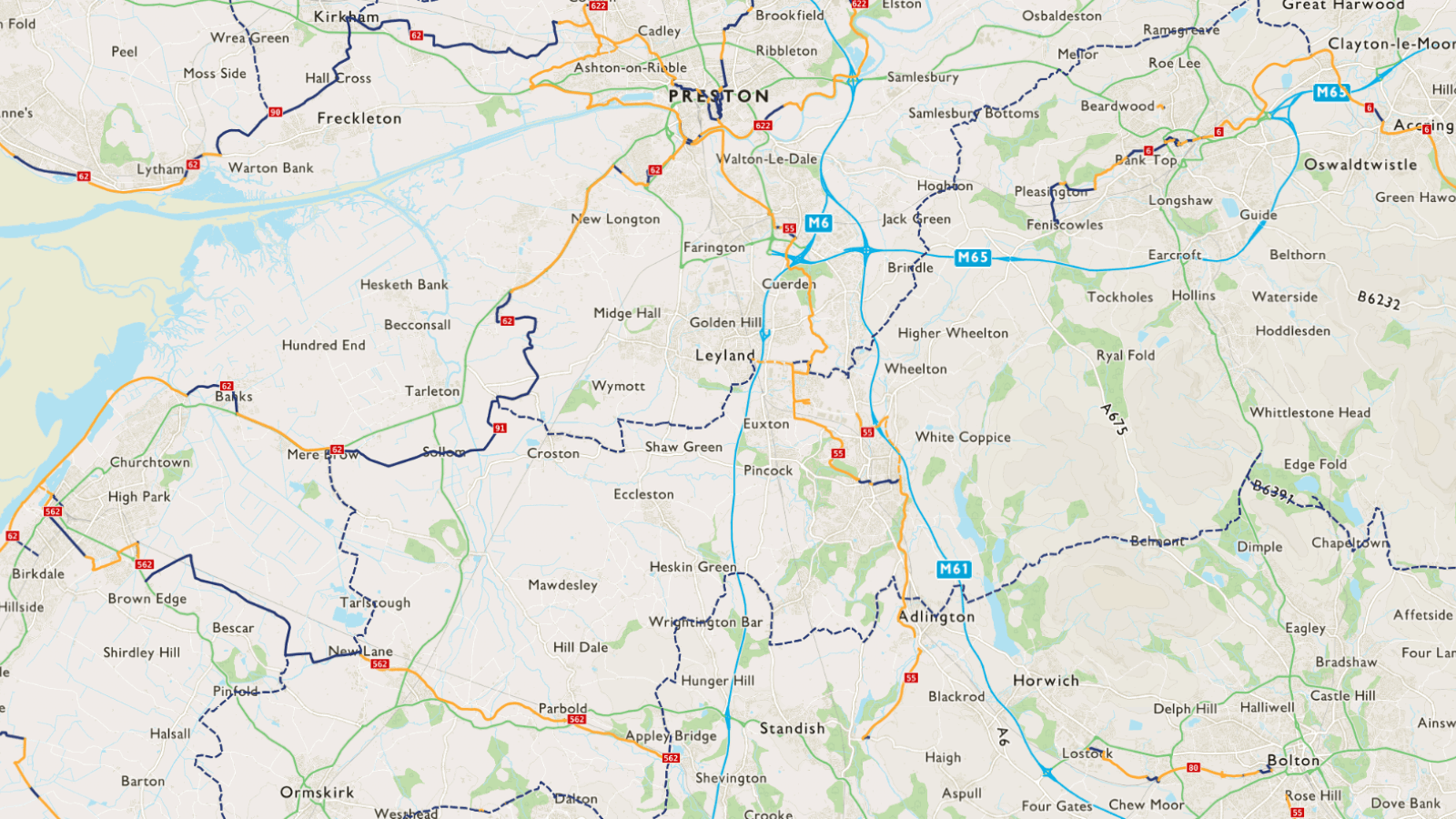 Route 55 runs in sections between Ironbridge and Preston via Telford, Newport, Stafford, Macclesfield, Stockport and Wigan or Bolton. Between Stafford and Stoke-on-Trent the route follows Route 5.