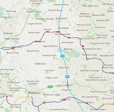 From Congleton, the route follows minor roads towards Twemlow Green and Goostrey.