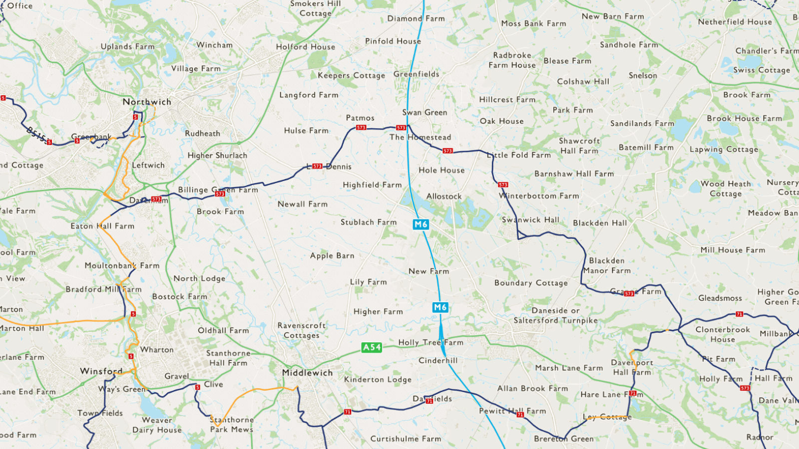 The landscape is undulating with no major climbs other than where the roads dip into river valleys. At Twemlow Green there is a very short section on the A535.