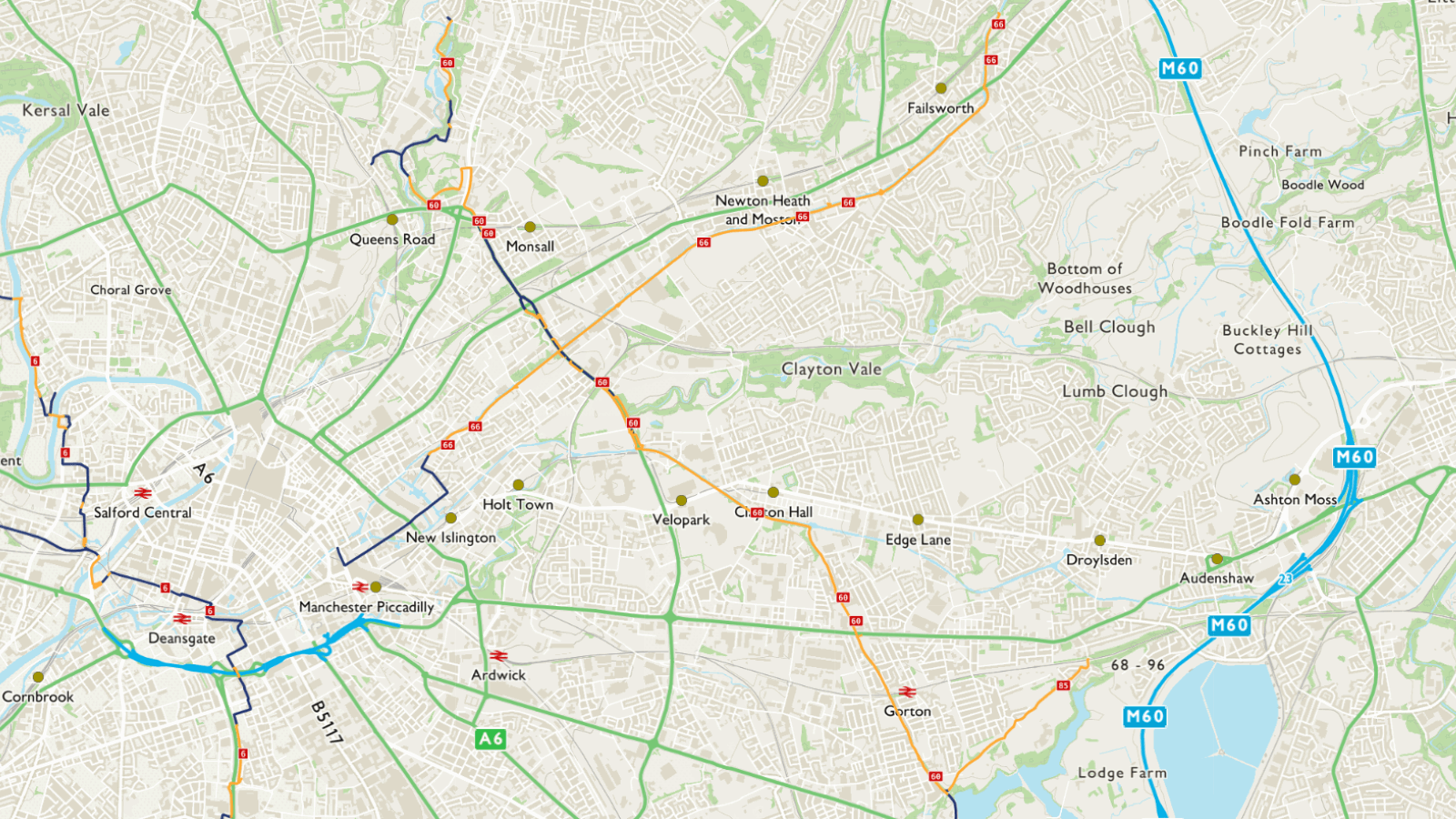 The route is described here from East Manchester to North Manchester but is signed in both directions. National Route 60 is fully open and signed between the northernmost edge of Houldsworth Golf Course in Reddish - from where it branches off from National Route 6 - and Harpurhey.