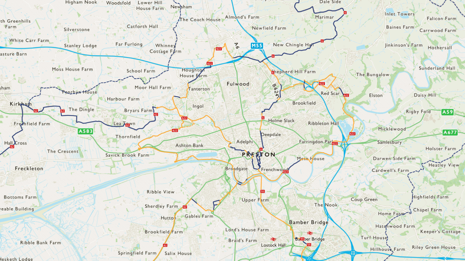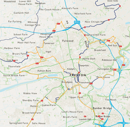 The route is a 21-mile long "greenway" encircling the city of Preston and is known locally as the Preston Guild Wheel. The route passes sights such as Preston Docklands, Avenham and Miller Parks and Brockholes Nature Reserve. The route follows mainly the River Ribble to the south, and goes as far as Broughton in the north. Around the route are 21 wooden mile markers showing how many miles you are from the start point at Avenham Park.