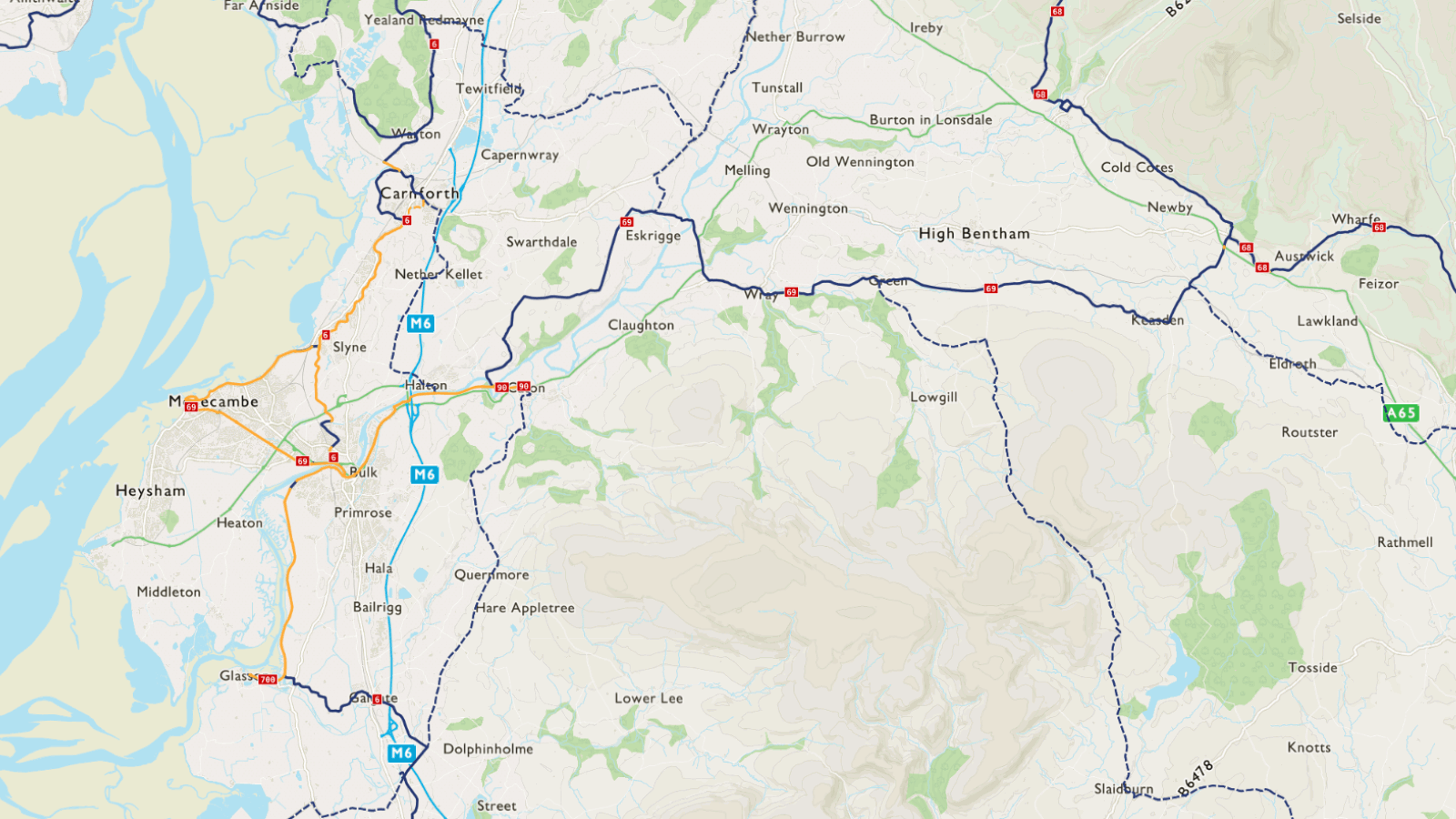 Between Morecambe and Caton the route follows the trackbed of an old railway line, and then makes its way to Clapham on roads.