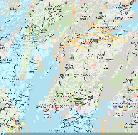The route leaves Glasgow by following the River Clyde to Dumbarton and then heads to Inverness.