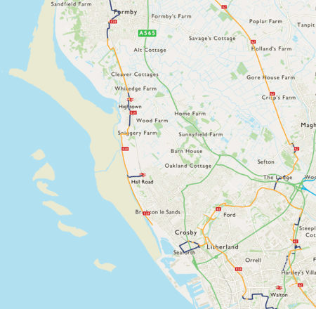 The route passes along the coast at Crosby, where you can see Antony Gormley's fascinating statues at Crosby beach.