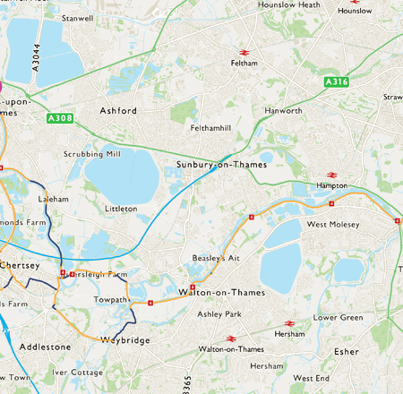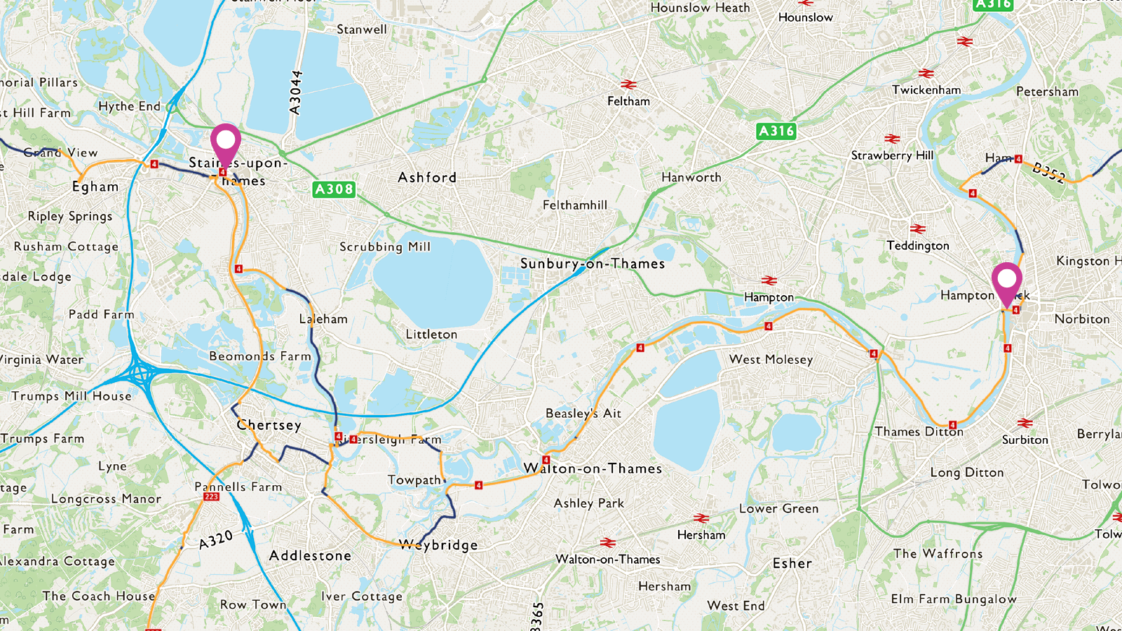 This delightful route alongside the Thames begins at Kingston station, from which you follow the signs to Hampton Court. Then you are away from the traffic, following a riverside path through the grounds of one of Britain's great historic palaces. Out of the park, the route continues along the Thames in relative tranquillity as you leave the city further and further behind. You pass Lutyens' Hampton Court Bridge, the houseboats of Tagg's Island, and Hurst Park, a former racecourse. At Shepperton, you can either follow the southerly section of National Route 4 via Chertsey to Staines or take the Shepperton and Weybridge ferry across the Thames.
