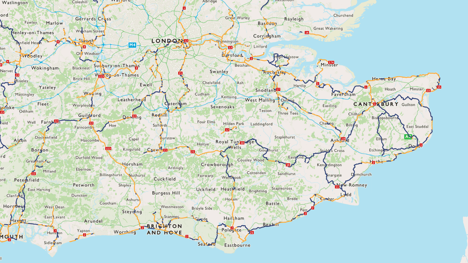 In the UK, the route mainly follows Route 4, Route 20, Route 21 and Route 2 as it passes through London, Surrey, West Sussex and East Sussex.