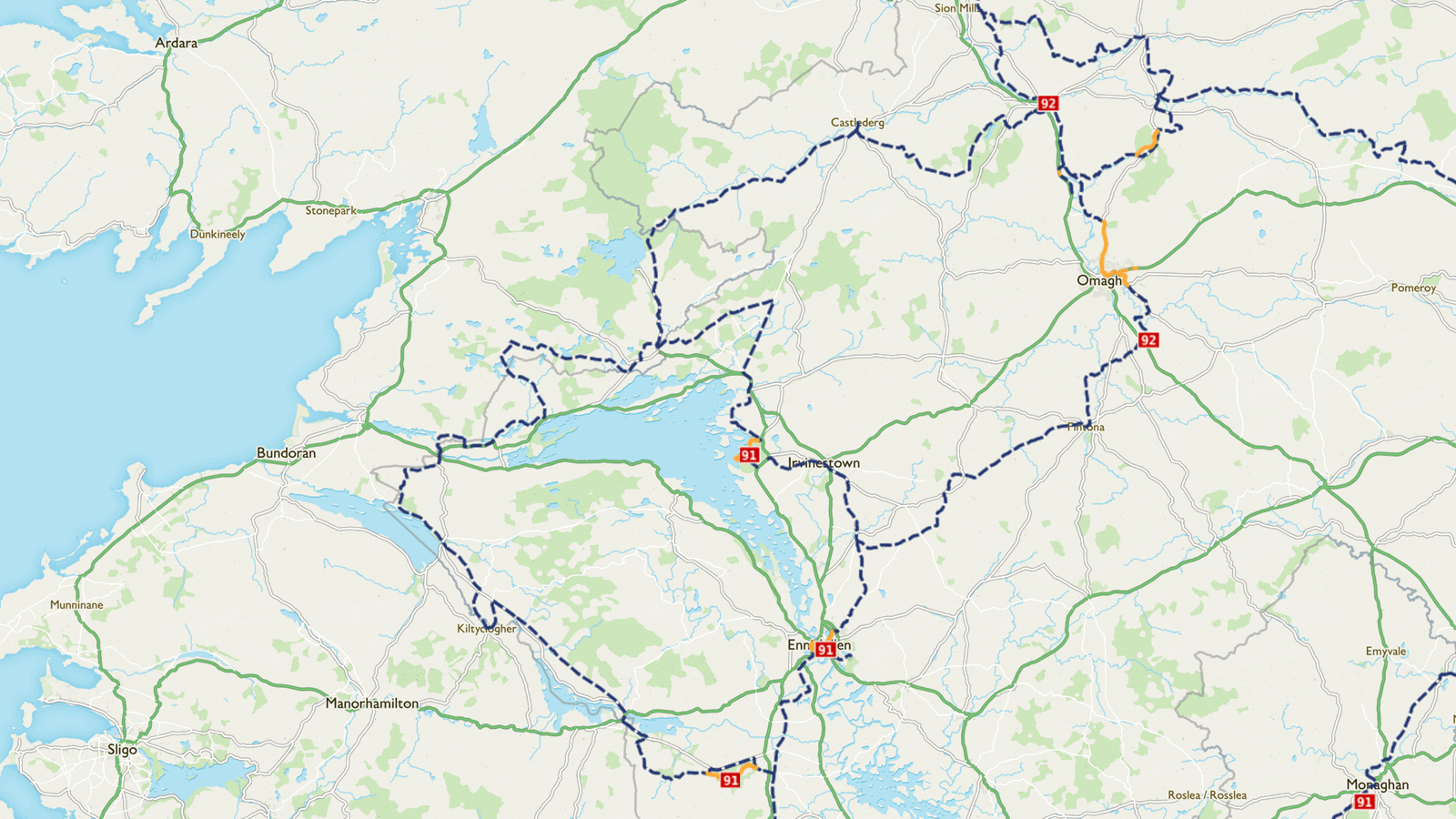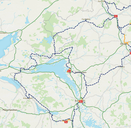 The route is split into two major loops which meet on an east-west trajectory between Belcoo and Florence Court, Drumcard (south of Enniskillen).