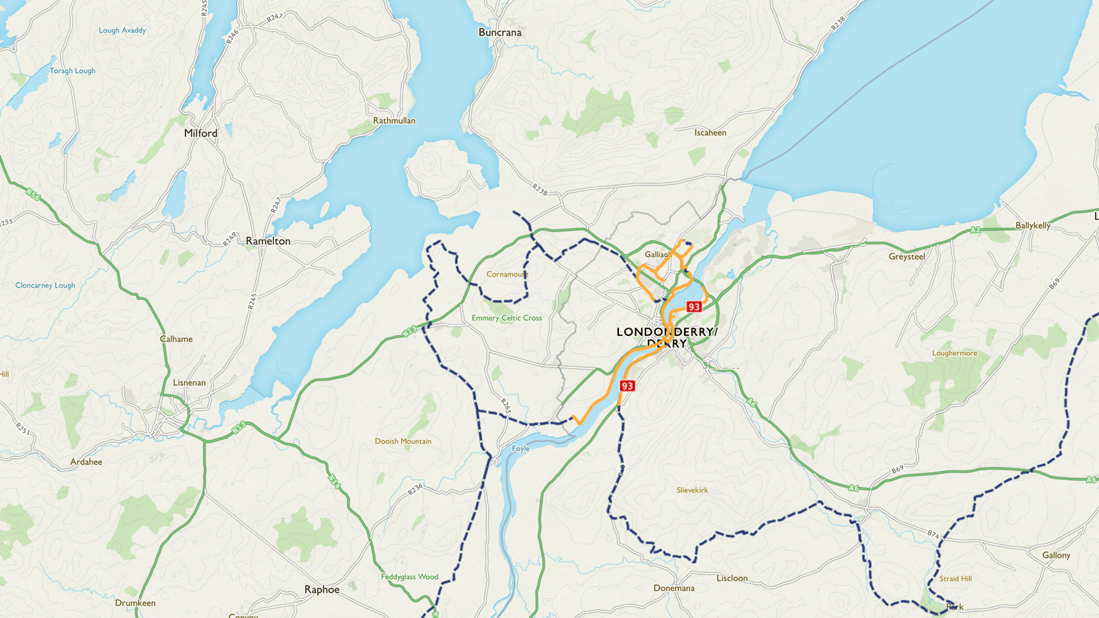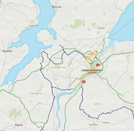 The route then falls toward the shore of Lough Swilly on quiet country roads, then veers southwards through Newtowncunningham.