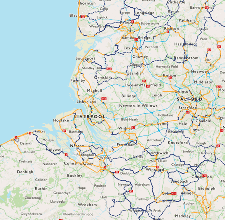 The route travels south-east through the eastern suburbs of Liverpool before turning east and following the River Mersey through Widnes and on through Warrington, Sale and Stockport.