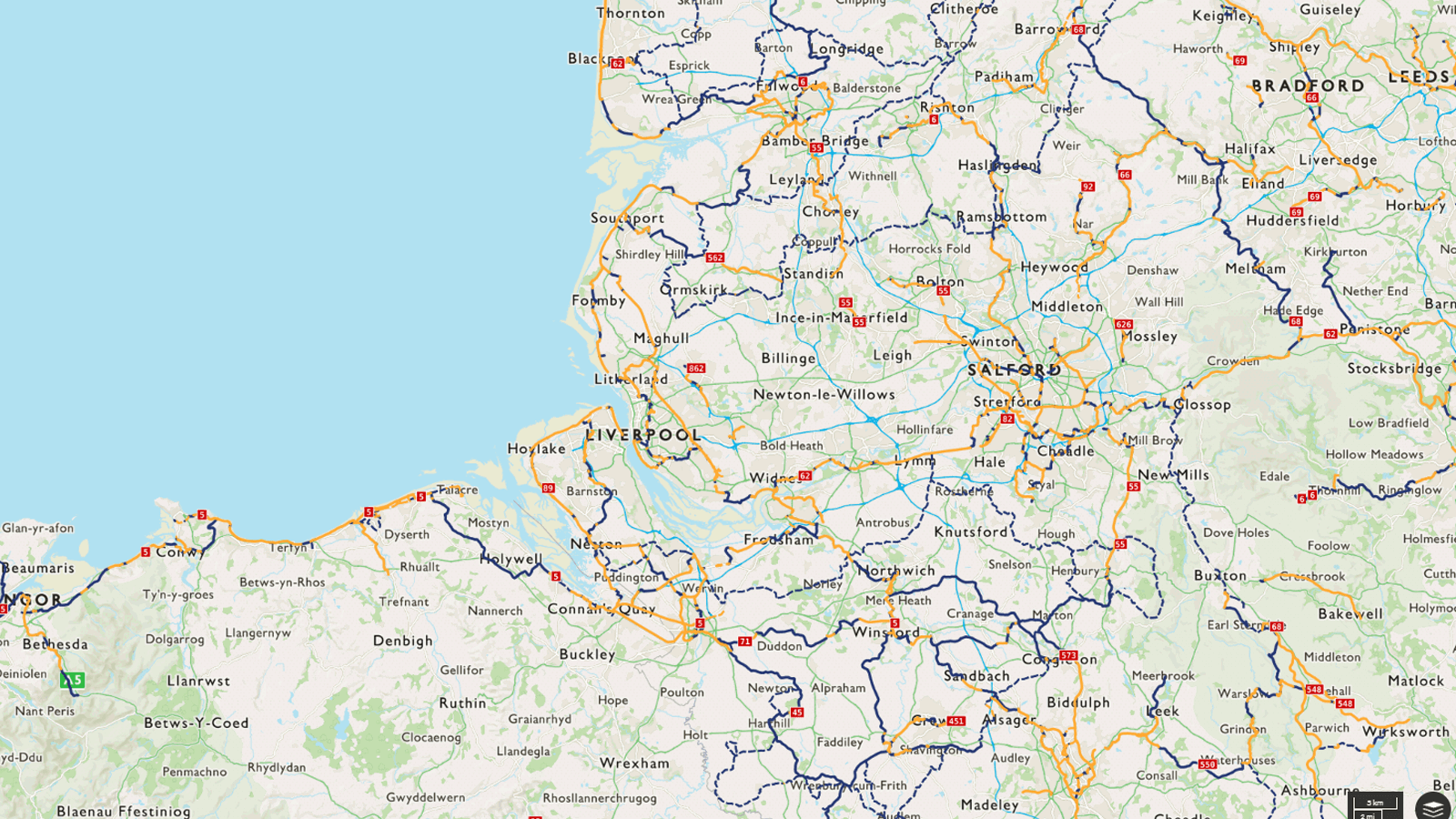 The Trans Pennine Trail (West) travels from Southport to Barnsley as using National Cycle Network Route 62, with a spur to Liverpool city centre being part of Route 56.